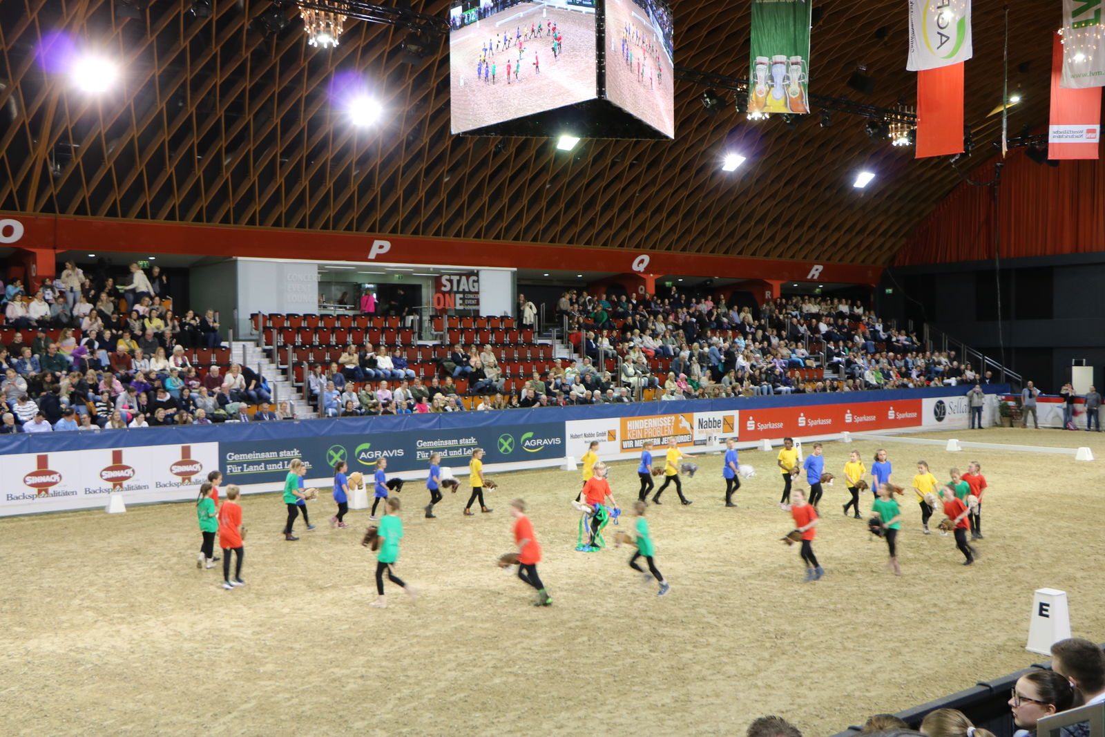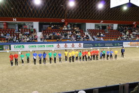 Die Aufregung war bei allen Beteiligten groß. Am späten Nachmittag fuhren alle Aktiven und ihre Eltern gemeinsam mit einem Bus nach Münster. Die Halle war gut gefüllt, der Sprecher in Höchstform, als die Gruppe einlief und ihre Kür präsentierte. Nicht alles lief reibungslos und ließ das Herz der beiden Lehrkräfte, der begleitenden Eltern und Zuschauer höherschlagen. Aber die Routine und die Reaktionsschnelligkeit von Deborah-Ann Schöpker und aller Kinder ließ sie sofort handeln und konnte das noch nie aufgetretene Problem schnell beheben. Der bekannte internationaler Dressur Richter und Trainer, Christoph Hess moderierte ebenso geschickt und die Begeisterung des Publikums fiel umso größer aus.